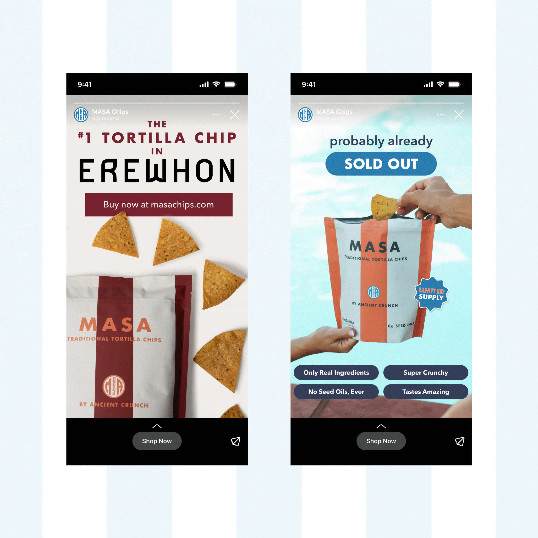 Create a series of ads for MASA that spotlight limited supply drops, grocery store availability, and a Bon Appétit feature.